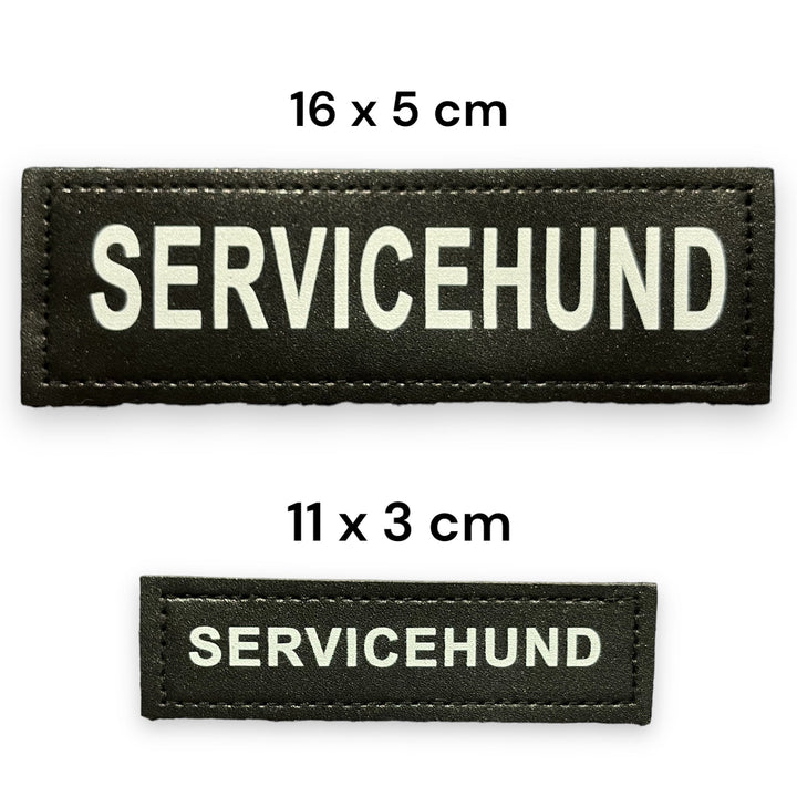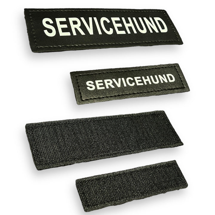 Merkene er lette å feste og fjerne ved behov, og den tydelige teksten SERVICEHUND sikrer at hundens funksjon er synlig i alle situasjoner.
