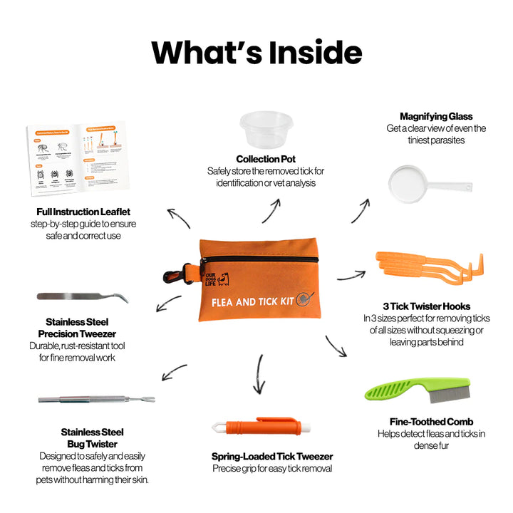 Beskytt hunden din mot flått og lopper med Our Dogs Life Flått- og loppefjerning-sett. Settet er utviklet for å gjøre det enkelt å oppdage og fjerne parasitter på en trygg måte, uten å skade huden.
