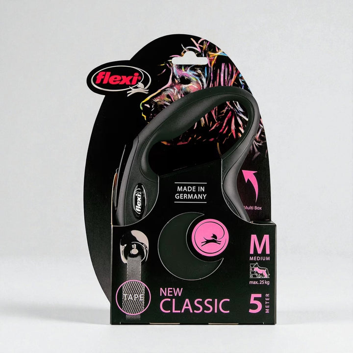 Flexi Classic Compact M 5m er et pålitelig og komfortabelt rullekobbel designet for mellomstore hunder opptil 25 kg. Kobbelet har en 5 meter lang tape, et presist og komfortabelt bremsesystem, og er kompatibelt med både LED-lyssystem og Multi Box – slik at du enkelt kan tilpasse kobbelet til dine behov.