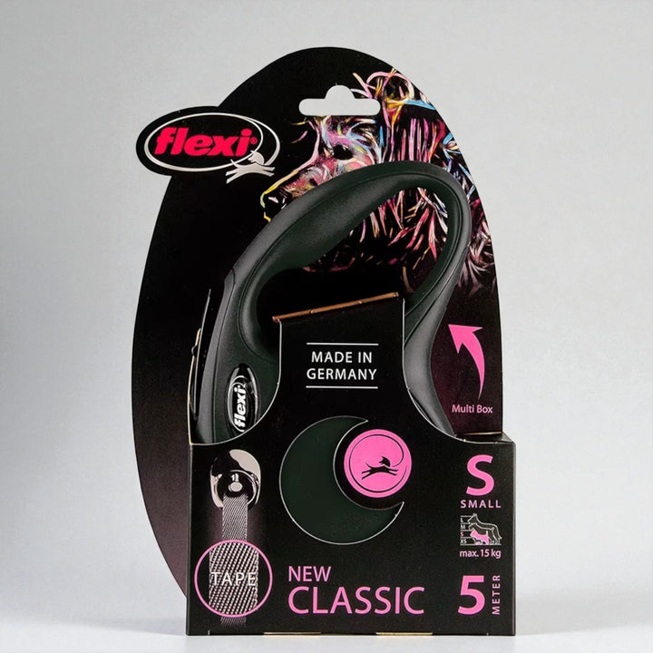 Flexi Classic Compact S 5m er et stilrent og funksjonelt rullekobbel for små hunder opptil 15 kg, perfekt for daglige turer med stil og sikkerhet. Med 5 meter tape-bånd, reflekterende beskyttelsesbelte, og kompatibilitet med LED-lys og Multi Box, får du et kobbel som kombinerer komfort, kontroll og synlighet i én smart løsning.