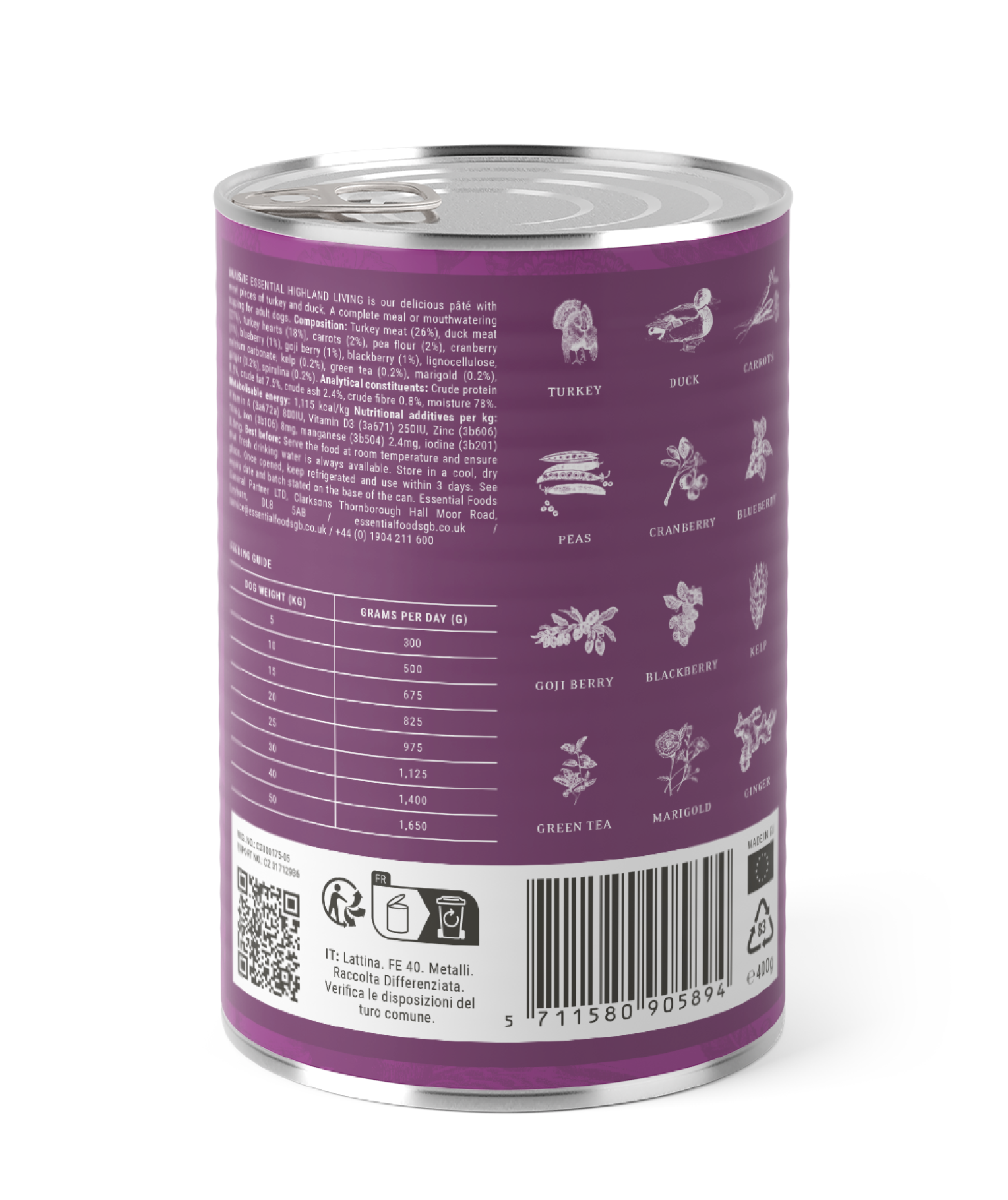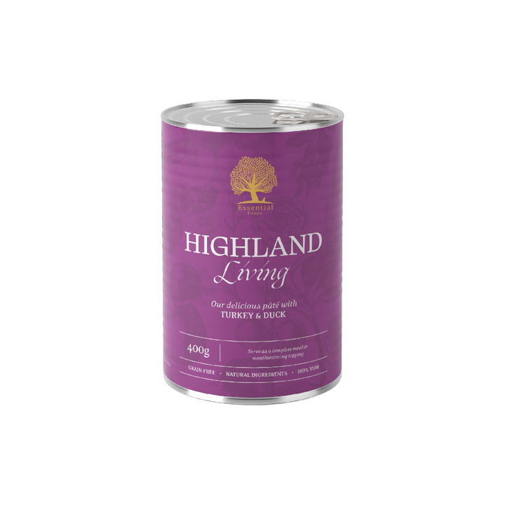 Highland Living Pâté er et smakfullt og fullverdig våtfôr laget for voksne hunder som elsker smaken av vilt. Den kornfrie oppskriften kombinerer 27 % reinsdyr og 23 % lam, supplert med næringsrike superingredienser som løvetann, blåbær, gojibær og spirulina.