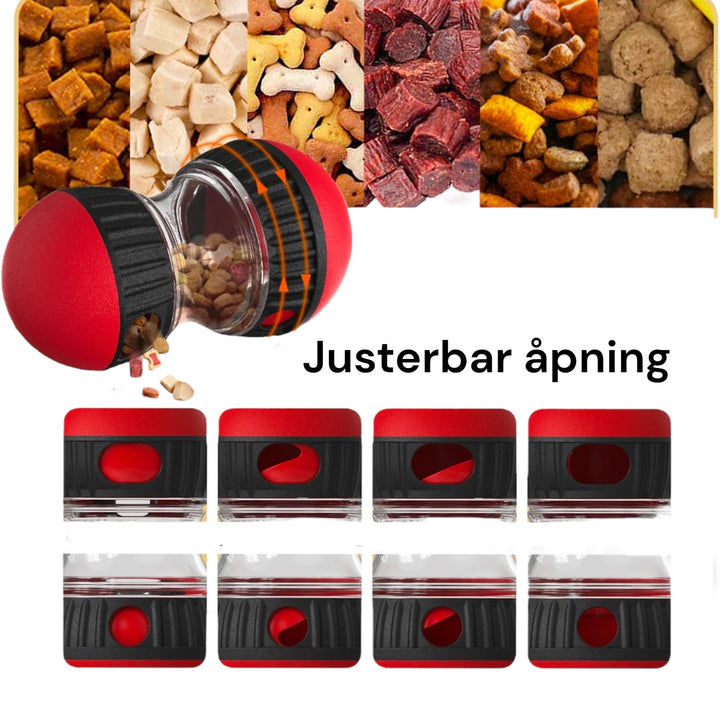 • Justerbar Åpning – Tilpass åpningen for å regulere hvor mye fôr som slippes ut, og gjør leken mer utfordrende for hunden.