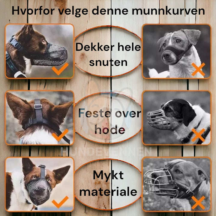 En munnkurv bør/skal kun brukes i spesielle situasjoner, og hunden skal holdes under oppsikt når den har på seg en munnkurv. Bruk munnkurven med sunn fornuft