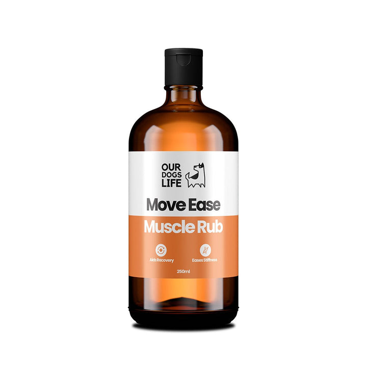 Muskelgel for hund – MoveEase Muscle Rub (250 ml) fra OurDogsLife, er en naturlig muskelgel med Epsom Salt, aloe vera og essensielle oljer som lindrer stivhet og støtter restitusjon hos hunder. Perfekt for aktive og eldre hunder.