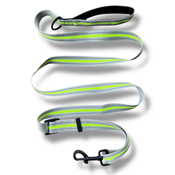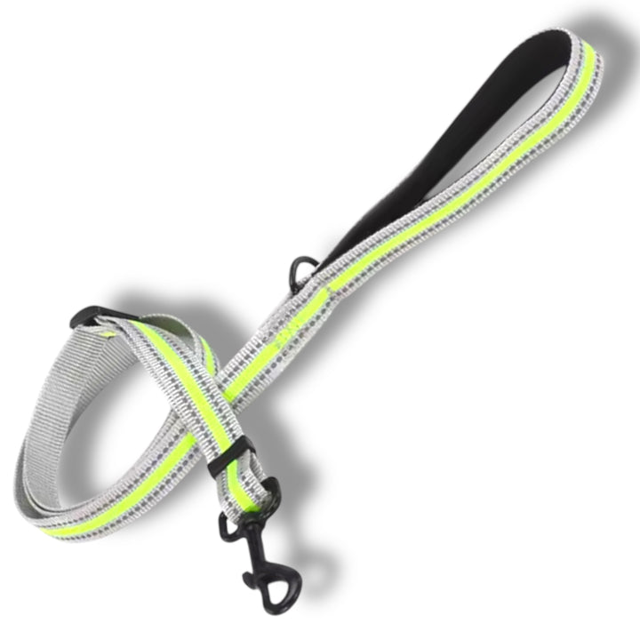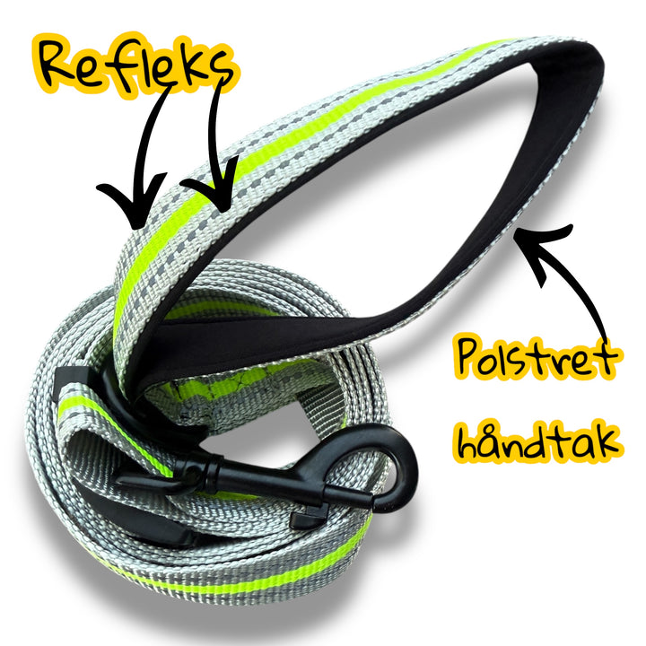 Dette slitesterke båndet er justerbart opp til 180 cm og har en solid karabinkrok i sort metall. Båndet er utstyrt med en kraftig refleksstripe for økt synlighet i mørket, og et komfortabelt, polstret håndtak som gir deg et godt grep – selv på lengre turer.